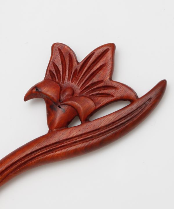 木そのものの風合いを活かした木彫りのかんざし。日本を象徴する花々がモチーフ。なめらかでしっかりとした軸が髪を安定してまとめ、一本挿すだけで上品な仕上がりに。