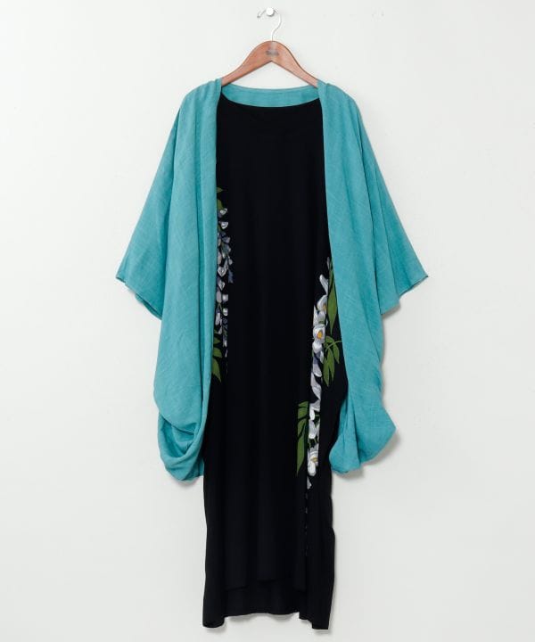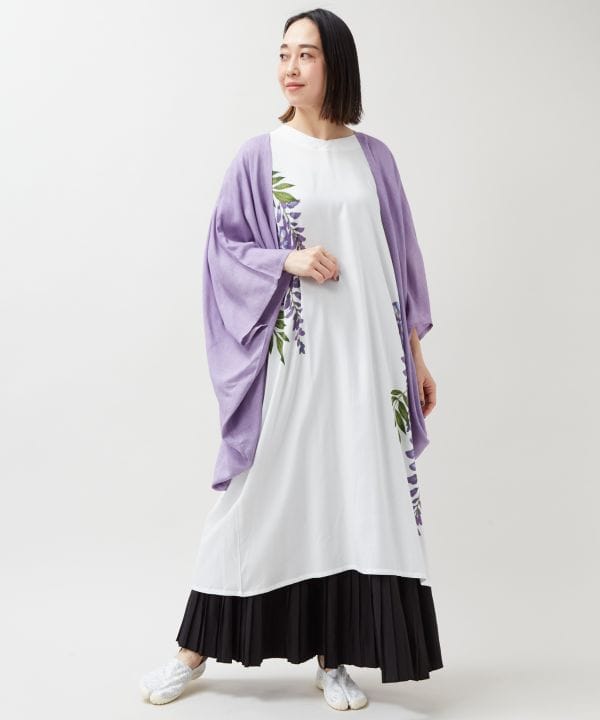 さらりとしたレーヨン素材が心地よい羽織付きワンピース。羽織とワンピースがセットになっているので、簡単にコーディネートが完成します。藤の花柄がやさしく華やぎを添え、気軽に和の装いを楽しめるデザイン。羽織にはUVカット加工を施した実用的な一着です。