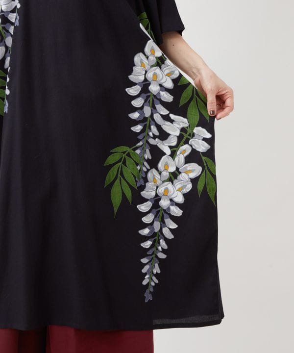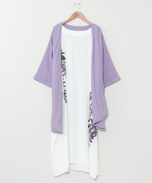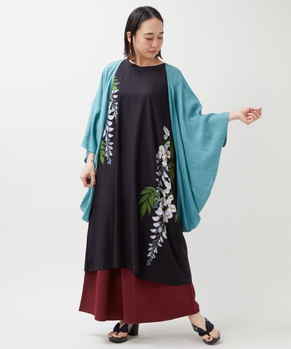 さらりとしたレーヨン素材が心地よい羽織付きワンピース。羽織とワンピースがセットになっているので、簡単にコーディネートが完成します。藤の花柄がやさしく華やぎを添え、気軽に和の装いを楽しめるデザイン。羽織にはUVカット加工を施した実用的な一着です。