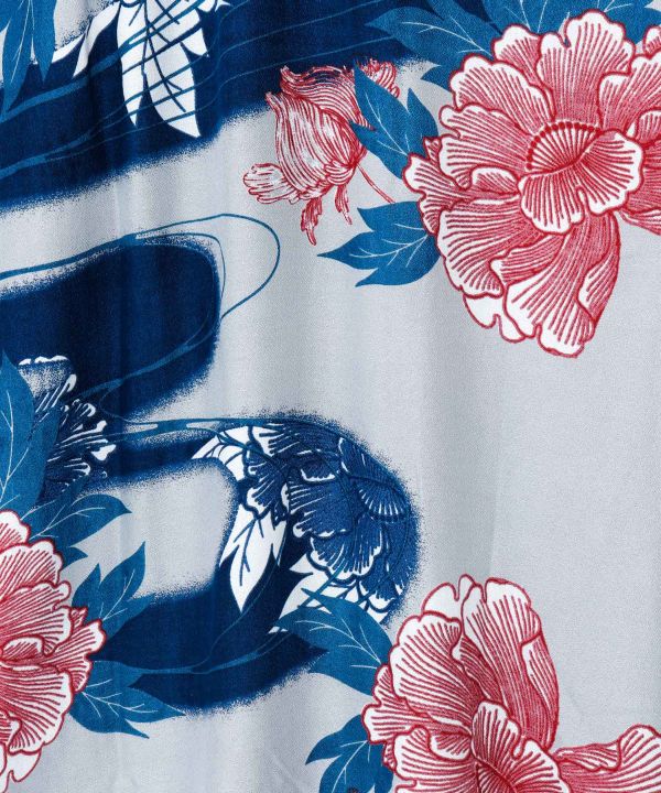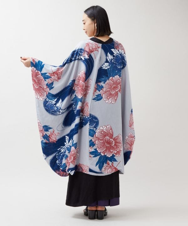 流水と水面に浮かぶ牡丹を描いたフリソデ風羽織。ゆったりとした袖が印象的で、さっと羽織るだけで華やかな雰囲気に。やわらかく落ち感のあるレーヨン素材を使用し、UVカット加工も施した実用的な一着です。