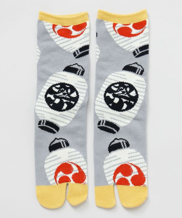 日本の祭りをテーマにした足袋靴下。オリジナルの祭りロゴを含む三柄展開で、にぎやかな雰囲気を表現しました。足にしっかりなじむ足袋型で履きやすく、日常使いにも取り入れやすいデザイン。足元から祭り気分を楽しめます。