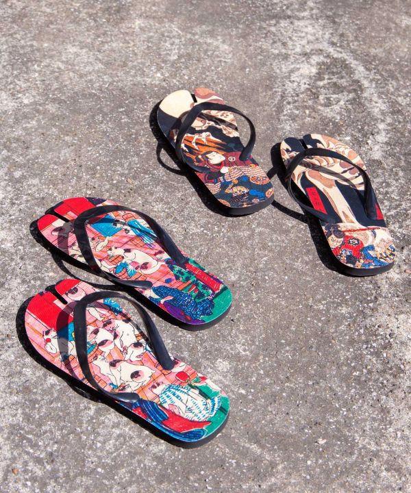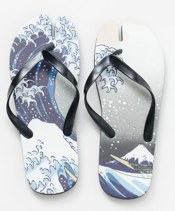 浮世絵柄を大胆にあしらった足袋型ビーチサンダル。指先が分かれた足袋仕様で、浴衣や和装にもなじむデザインです。軽やかで扱いやすく、水辺やおでかけにも便利。足元から和の粋を取り入れられる個性派アイテム。