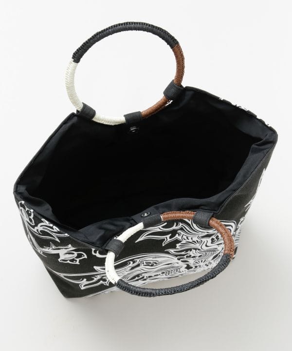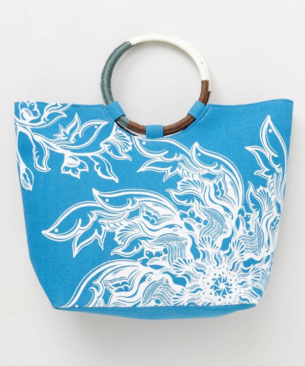 【Amina×VORRUK】タイのアーティストVORRUKとのコラボシリーズ[FLOWER OF THE SUN]。朝に花を咲かせるサンユウカは、一日の始まりに物事が動き出す吉兆を象徴する花。そして白、風車をモチーフに、過去を大切にしながら新しい風を迎える「温故知新」の想いを込めたデザイン。花が風に揺れ、身体に新しい流れが吹き込むような、始まりのエネルギーを感じさせるアートワーク。マチ付きのリングハンドル仕様。開口部はマグネットボタン、裏地付きの内ポケットあり。