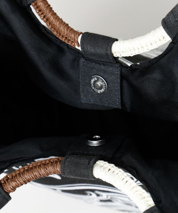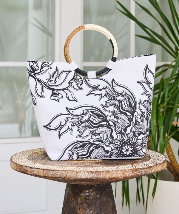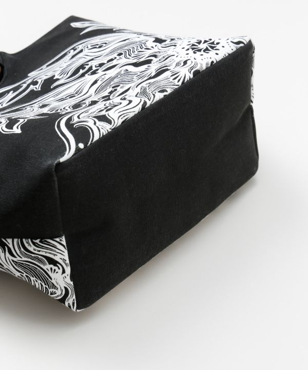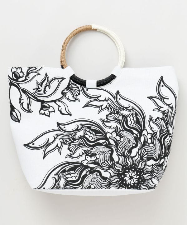 【Amina×VORRUK】タイのアーティストVORRUKとのコラボシリーズ[FLOWER OF THE SUN]。朝に花を咲かせるサンユウカは、一日の始まりに物事が動き出す吉兆を象徴する花。そして白、風車をモチーフに、過去を大切にしながら新しい風を迎える「温故知新」の想いを込めたデザイン。花が風に揺れ、身体に新しい流れが吹き込むような、始まりのエネルギーを感じさせるアートワーク。マチ付きのリングハンドル仕様。開口部はマグネットボタン、裏地付きの内ポケットあり。