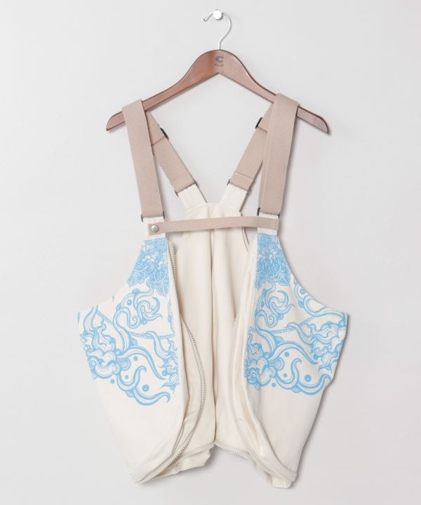 【Amina×VORRUK】タイのアーティストVORRUKとのコラボベストBAG。[HEAVEN OF THE EARTH]天から大地を覗くような構図で、雲と蓮が空と地をつなぎ、日常に潜む自然の美しさや神秘を表現。日々移ろいゆく日常の中で見つけたもの、大地に咲く花、流れていく雲など、身近な自然へのリスペクトを込めた世界観を表現。大容量収納に加え、ポケット付きのベストへと変形する2WAY仕様。旅や野外イベントでも手ぶらで軽快に過ごせる実用性を備えた一着。アートと機能が融合したユニークなアイテム。