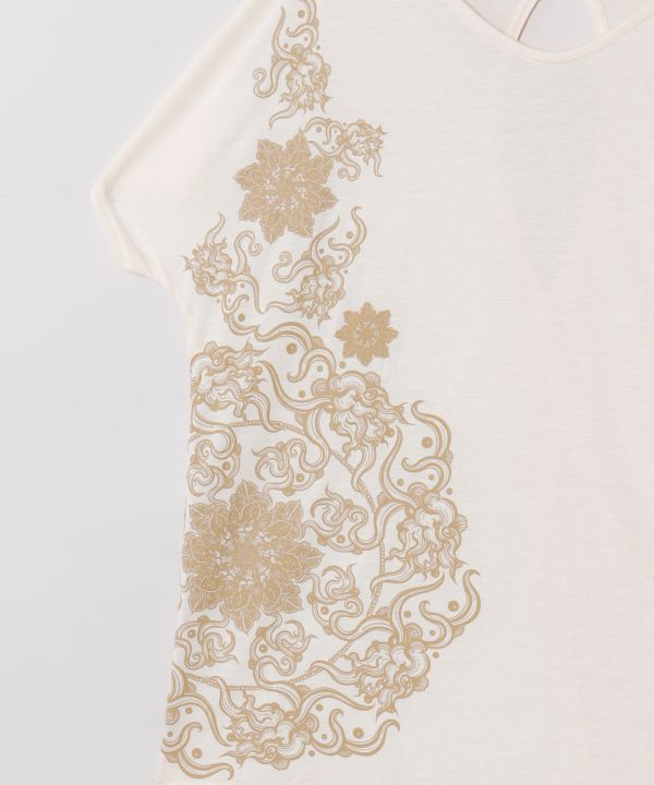 【Amina×VORRUK】タイのアーティストVORRUKとのコラボ。朝日に咲く花と太陽をテーマにした曼荼羅のようなデザインが印象的なTシャツ。背中の開きとドローストリングの仕様で軽やかなシルエットが楽しめます。薄手で伸び感のある素材が心地よい一枚です。