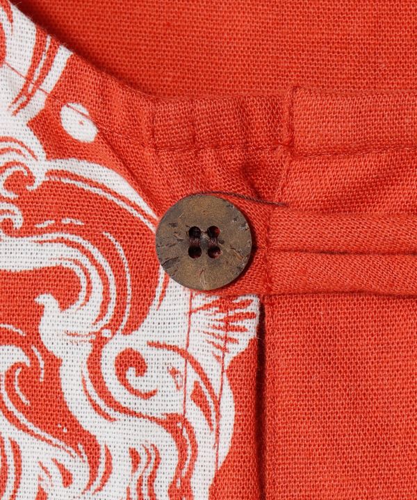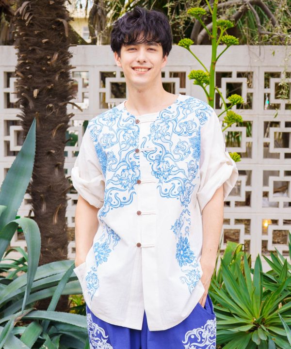 【Amina×VORRUK】タイのアーティストVORRUKとのコラボ。朝日に咲く花と太陽をテーマにした曼荼羅のようなデザインが印象的なメンズシャツ。モーホムに着想を得たゆったりとしたシルエットで、脇のスリットや切替生地が動きやすさと快適さを叶えます。シンメトリーなプリントが存在感を放ち、旅先や日常にもおすすめの一着です。