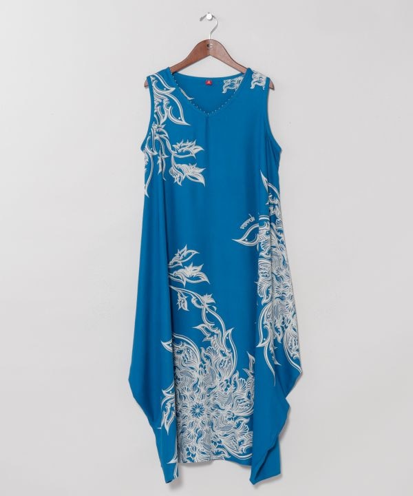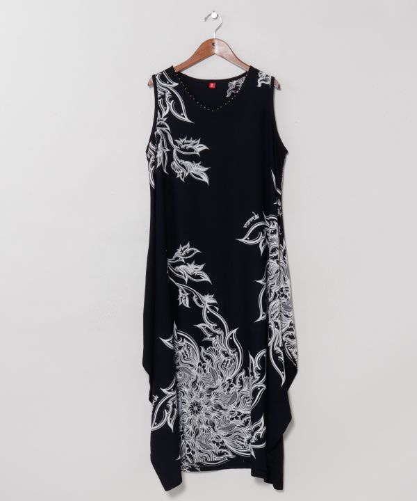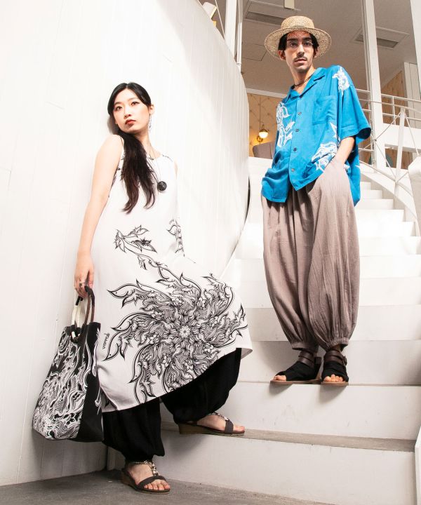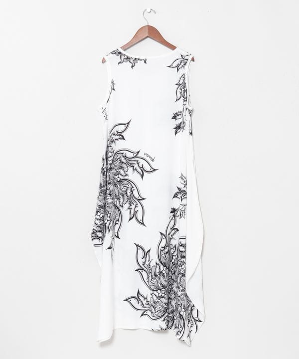 【Amina×VORRUK】タイのアーティストVORRUKとのコラボ。タイのサンユウカの花と風車を組み合わせたモチーフが印象的なワンピース。アシンメトリーに配置された美しく力強いプリントが個性を引き立てます。柔らかなレーヨン素材とVネックが、涼やかで軽やかな着心地を叶えるアイテムです。