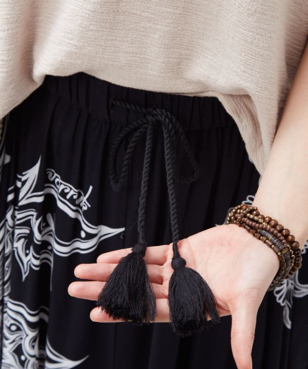 【Amina×VORRUK】タイのアーティストVORRUKとのコラボ。タイのサンユウカの花と風車を組み合わせたモチーフが印象的なスカート。変形シルエットとたっぷり入ったドレープが、動きに合わせて美しい表情を生み出します。柔らかなレーヨン素材で、軽やかな着心地も魅力のアイテムです。