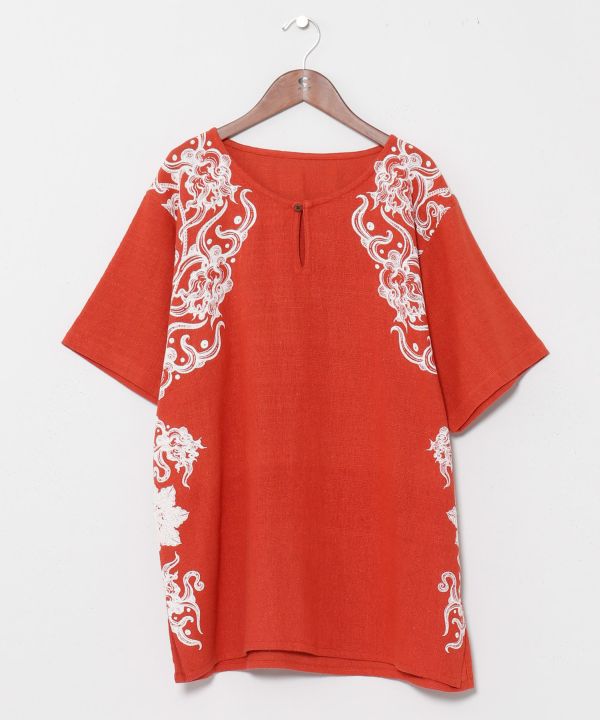 【Amina×VORRUK】タイのアーティストVORRUKとのコラボ。朝日に咲く花と太陽をテーマにした曼荼羅のようなデザインが印象的なトップス。シンメトリーなプリントが大胆に配置され、ざっくりとした綿素材で風通しが良く、涼しく着られます。