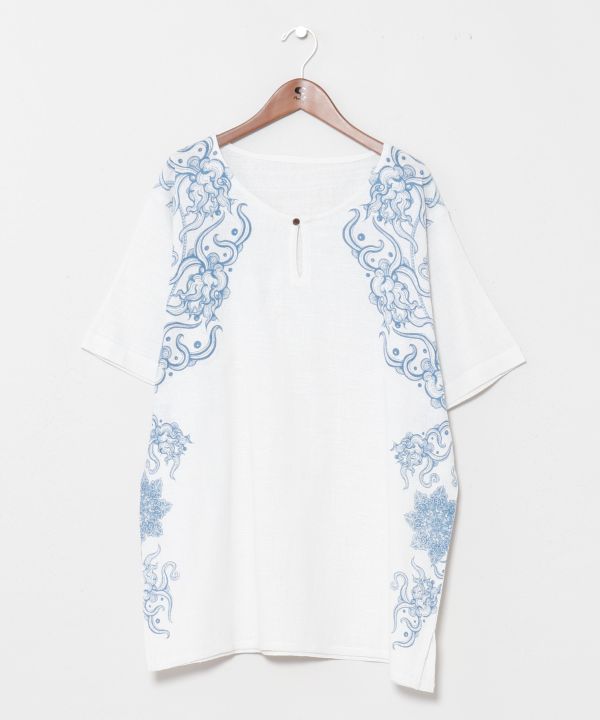 【Amina×VORRUK】タイのアーティストVORRUKとのコラボ。朝日に咲く花と太陽をテーマにした曼荼羅のようなデザインが印象的なトップス。シンメトリーなプリントが大胆に配置され、ざっくりとした綿素材で風通しが良く、涼しく着られます。