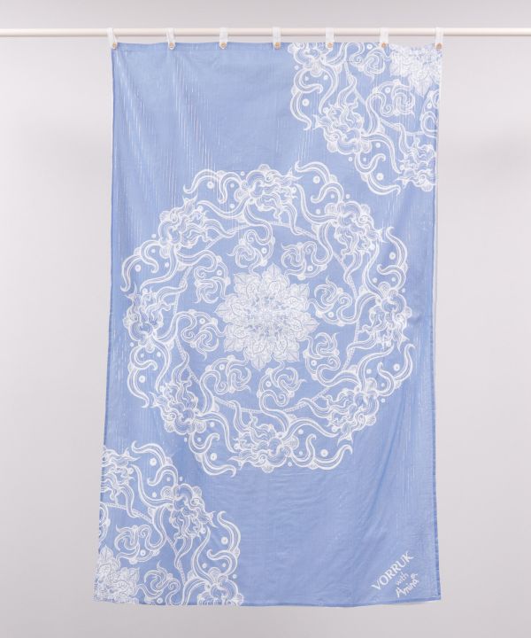 【Amina×VORRUK】タイのアーティストVORRRUKとのコラボアイテム。天から大地を覗いているような構図で、周りの雲と中心の蓮が大地を繋いでいる柄。大地に咲く花、流れていく雲など、身近な自然へのリスペクトを込めた世界観を表現したシリーズで、二枚重ねの生地が自然光をやさしく室内に届けてくれます。