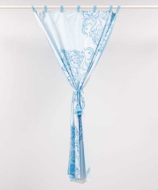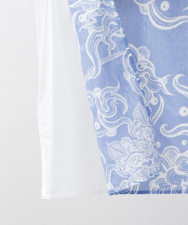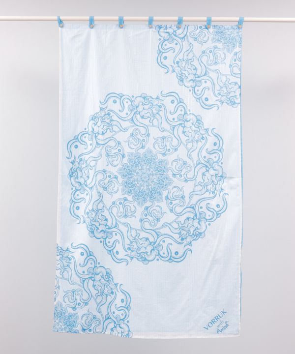 【Amina×VORRUK】タイのアーティストVORRRUKとのコラボアイテム。天から大地を覗いているような構図で、周りの雲と中心の蓮が大地を繋いでいる柄。大地に咲く花、流れていく雲など、身近な自然へのリスペクトを込めた世界観を表現したシリーズで、二枚重ねの生地が自然光をやさしく室内に届けてくれます。
