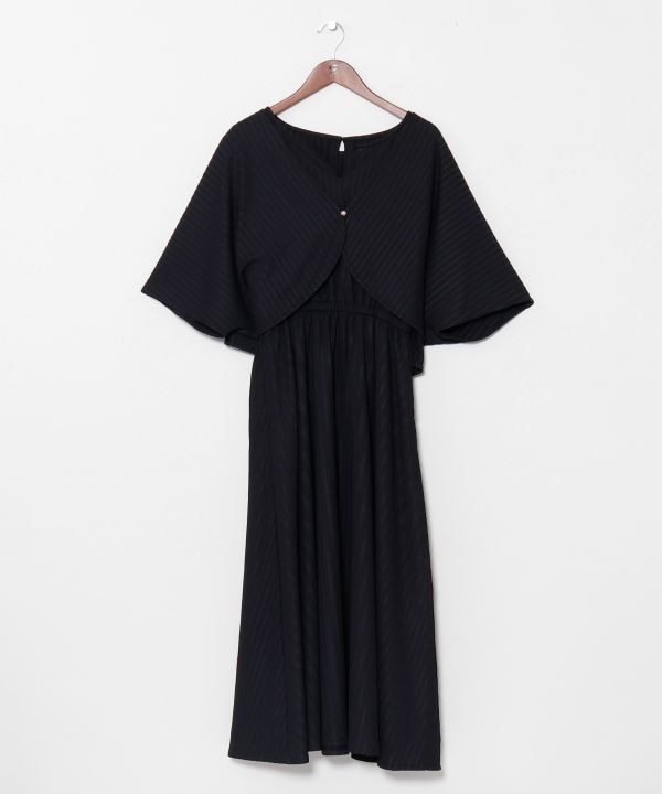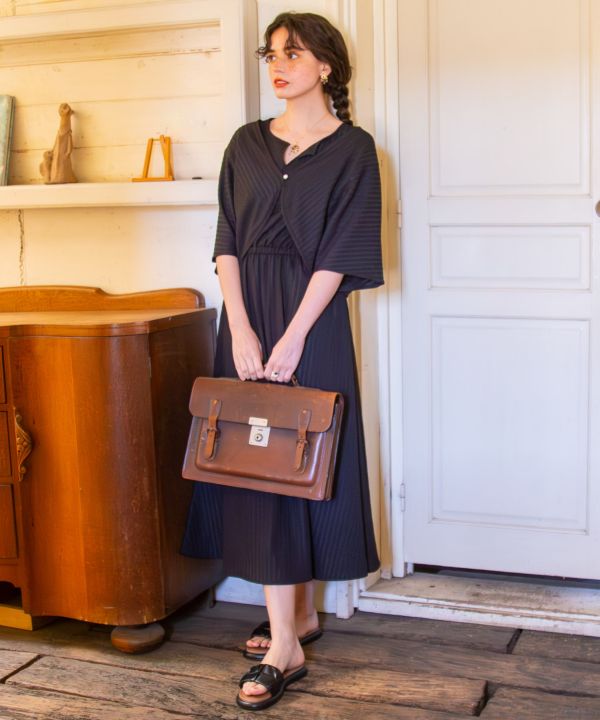 やわらかなシルエットのワンピースとボレロ風カーディガンのセットアップ。ウエストはゴム仕様で着心地よく、紐での調整も可能。裏地付きで安心感があり、ポケットも付いて実用性が高い一着。