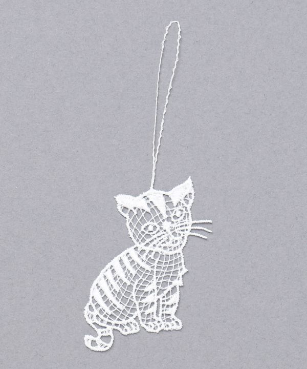 ドイツの伝統的なプラウエンレースを使用したオーナメント。子猫の愛らしい姿を軽やかなレースで表現。窓辺や壁に吊るして、さりげない可愛らしさを演出します。【ドイツ直輸入】