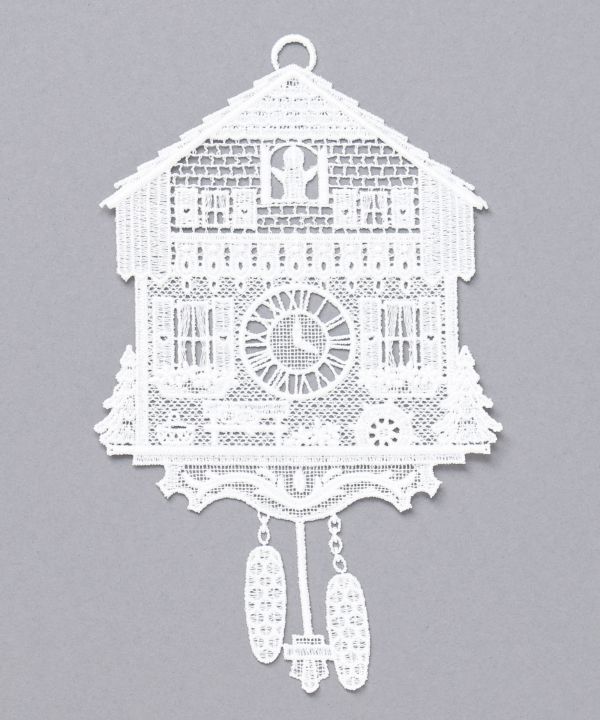 ドイツの伝統的なプラウエンレースを使用したオーナメント。鳩時計をモチーフにした緻密なレースワークが印象的で、クラシカルな雰囲気を引き立てます。【ドイツ直輸入】