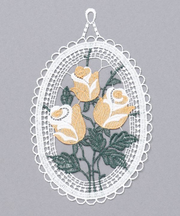 ドイツの伝統的なプラウエンレースを使用したオーナメント。立体感のあるバラのデザインが華やかで、伝統工芸の魅力が光る一枚。お部屋に優雅なアクセントを添えます。【ドイツ直輸入】
