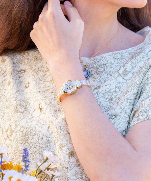 フィレンツェの時計塔をイメージした文字盤が印象的な腕時計。カラフルなバングルデザインで手元を華やかに彩ります。ワンタッチで簡単に着脱でき、旅先や日常のおしゃれに取り入れやすいアイテムです。