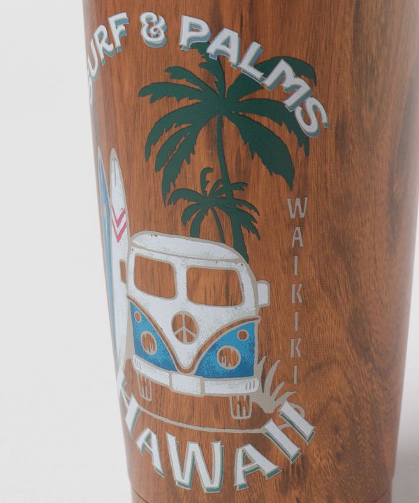 ハワイのビーチ風景をウッド調ベースとイラストで描いたヴィンテージテイストの蓋付きタンブラー。保冷・保温に便利な仕様で、たっぷり飲みたい方にも嬉しいサイズ感です。