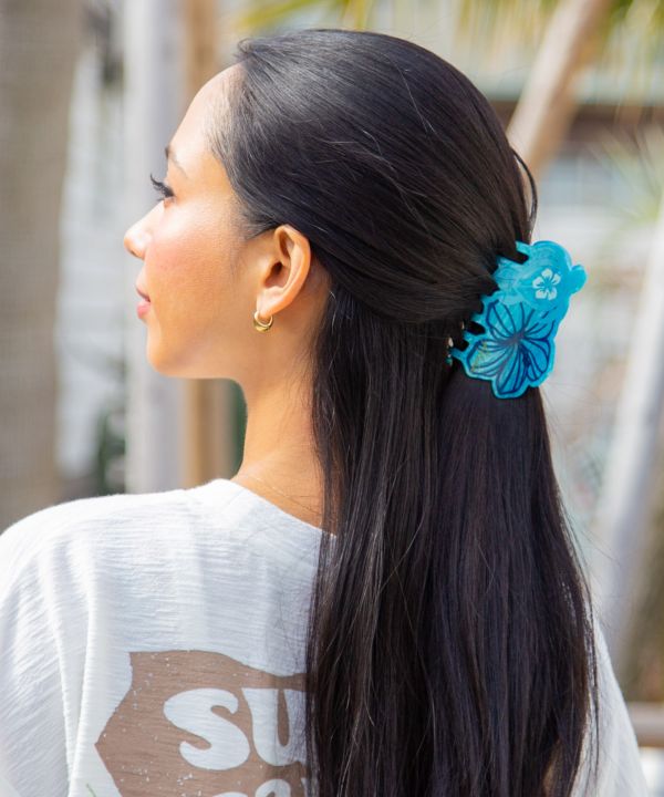 ハイビスカスとホヌを組み合わせた爽やかなヘアクリップ。大海の守り神であるホヌをお守りのように身に着けられるデザインです。華やかなモチーフがまとめ髪に映え、バッグに付けてチャームとして楽しむのもおすすめです。
