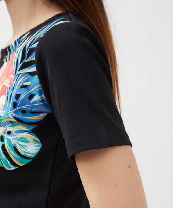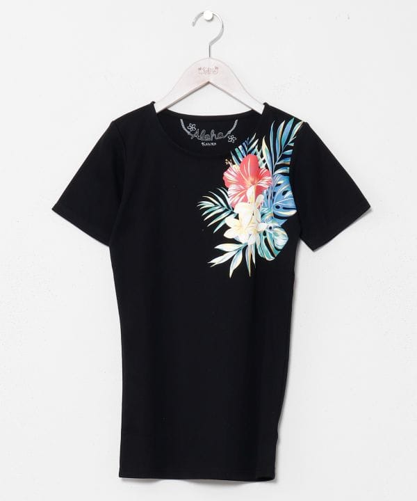 肌触りの良いコットン素材で仕立てたTシャツ。身体のラインを美しく見せるシルエットに、華やかで繊細なボタニカル柄をあしらいました。部分的に施されたラメプリントがきらりと光り、さりげないアクセントに。デニムやスカートと合わせて上品なリゾートスタイルを楽しめる一着です。