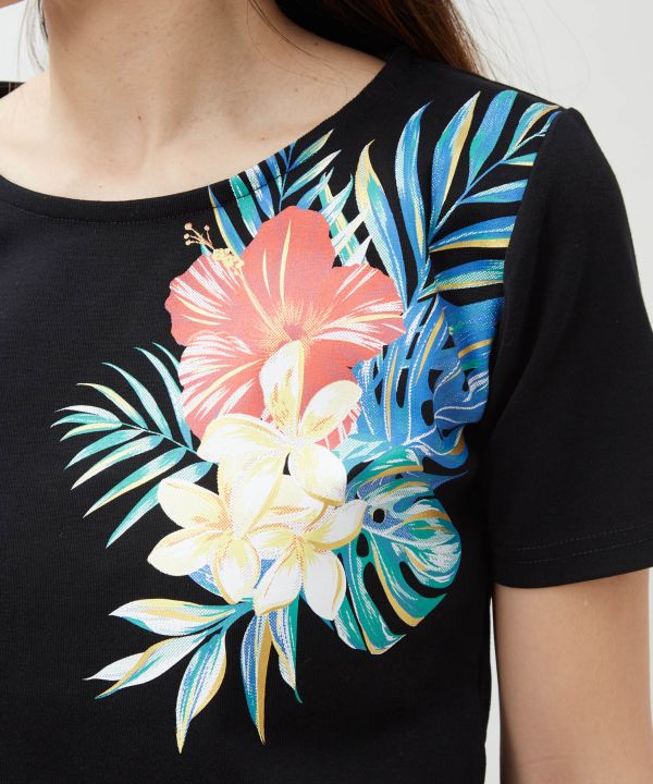 肌触りの良いコットン素材で仕立てたTシャツ。身体のラインを美しく見せるシルエットに、華やかで繊細なボタニカル柄をあしらいました。部分的に施されたラメプリントがきらりと光り、さりげないアクセントに。デニムやスカートと合わせて上品なリゾートスタイルを楽しめる一着です。