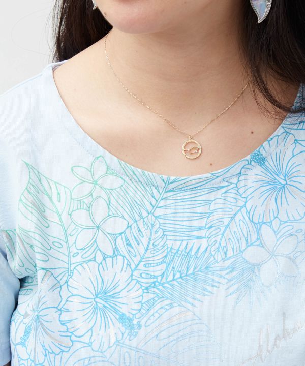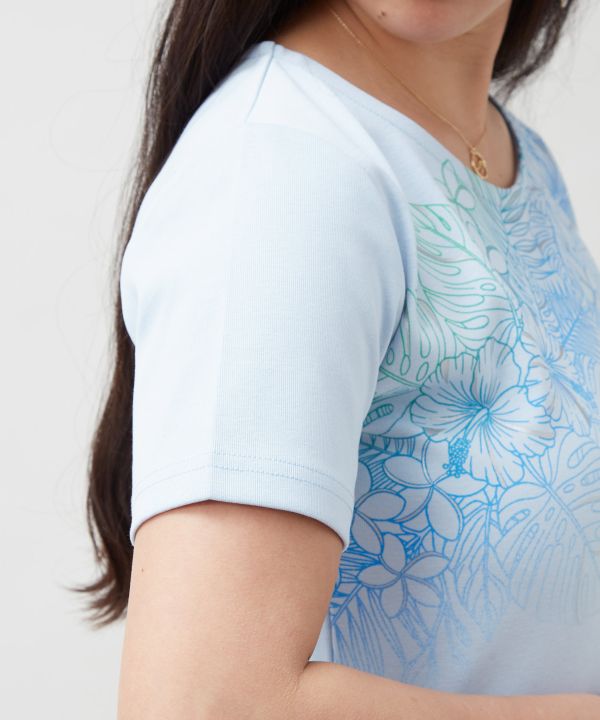 やわらかなコットン素材のTシャツ。身体のラインをきれいに見せるシルエットに、涼やかなグラデーションのボタニカル柄を重ねました。部分的に施したラメプリントが光を受けてきらりと輝き、華やかさをプラス。リゾート感あふれるコーディネートにおすすめの一着です。