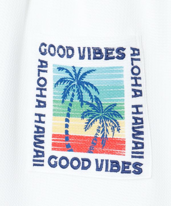 立体感のあるふくれジャカード素材を使用したメンズハーフパンツ。凹凸のある生地に、サーフ感漂う刺しゅうとプリントをあしらい存在感のあるデザインに仕上げました。程よくゆとりのあるシルエットで動きやすく、Tシャツやタンクトップと合わせたリラックスコーディネートにおすすめです。