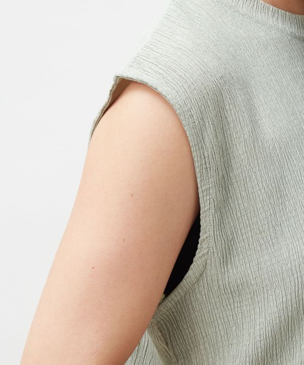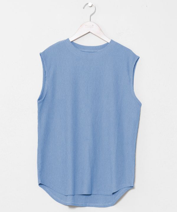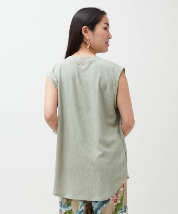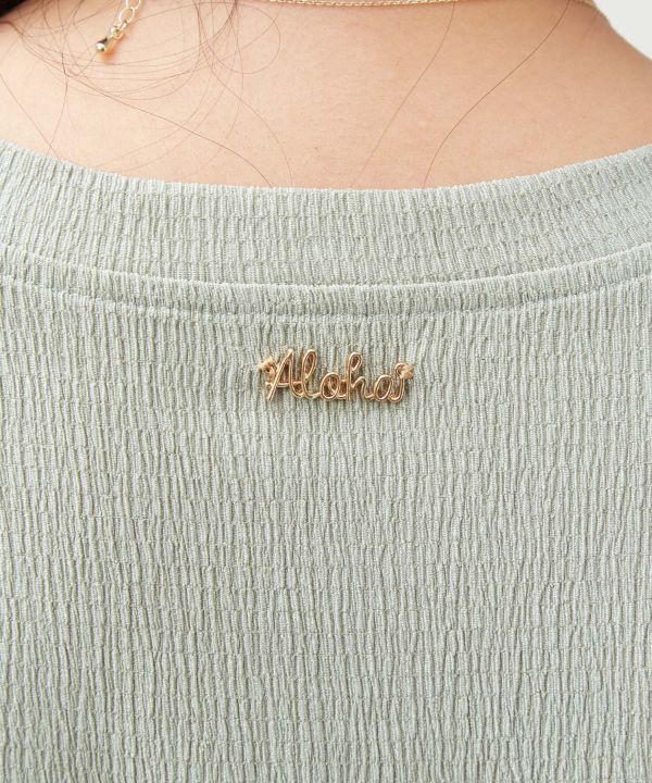 軽やかなシアーサッカー素材のトップス。凹凸のある生地がさらりとした着心地を叶え、爽やかな印象を演出します。後身頃にはゴールドのAlohaチャームをさりげなくあしらい、後ろ姿にも華やかなアクセントをプラス。シンプルながらも上品なリゾートコーディネートにおすすめです。