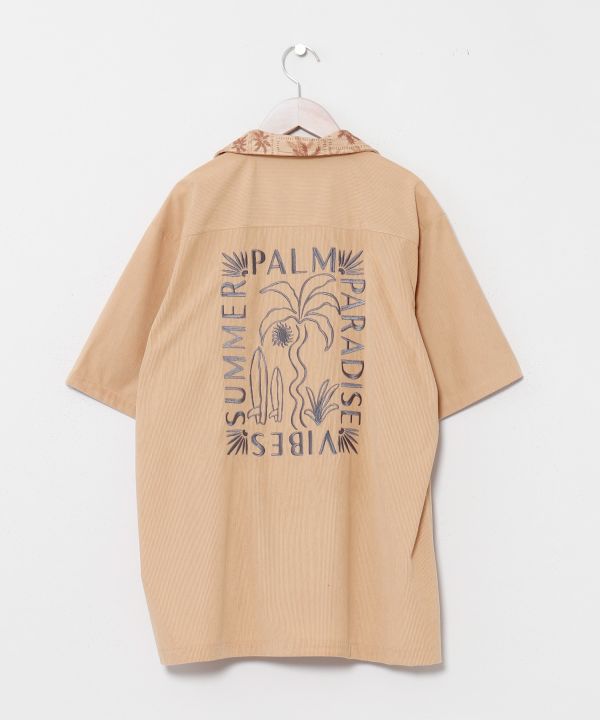 ヤシ柄の生地にロゴ刺しゅうをあしらったメンズ開襟シャツ。表情のあるコーデュロイ素材がほどよいヴィンテージ感を演出します。ゆったりとしたシルエットで羽織りとしても活躍。同シリーズのハーフパンツと合わせたセットアップコーディネートもおすすめです。
