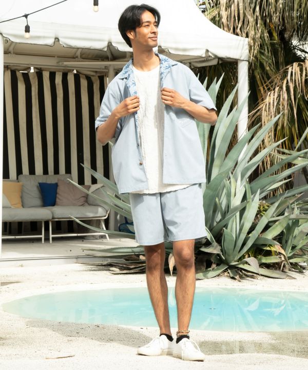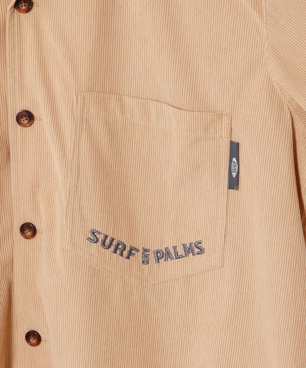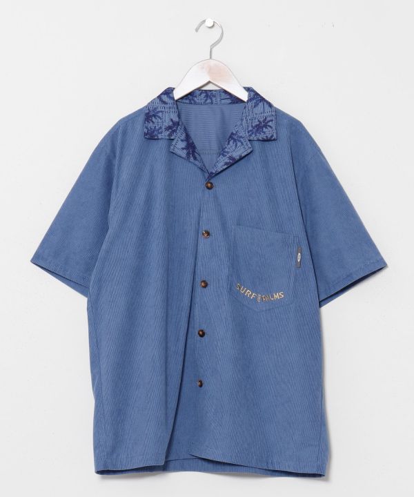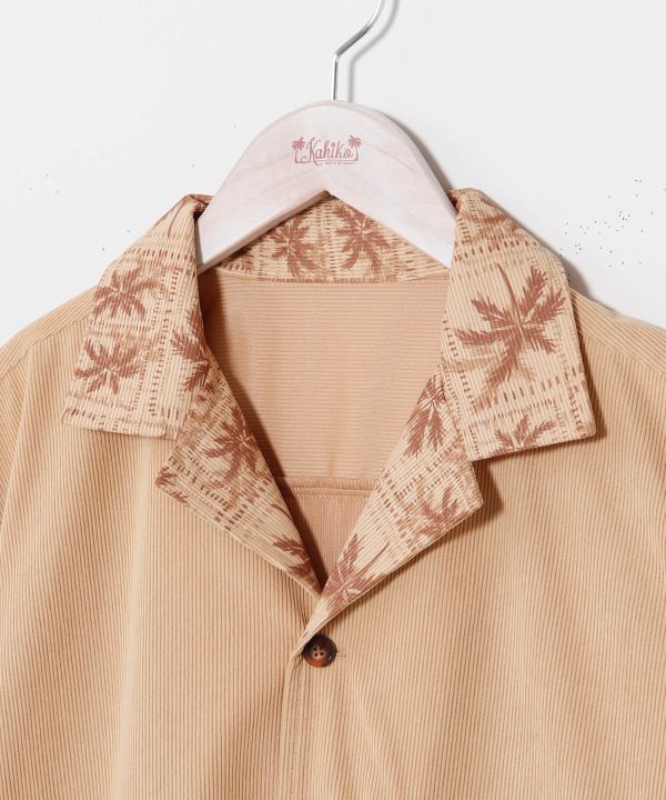 ヤシ柄の生地にロゴ刺しゅうをあしらったメンズ開襟シャツ。表情のあるコーデュロイ素材がほどよいヴィンテージ感を演出します。ゆったりとしたシルエットで羽織りとしても活躍。同シリーズのハーフパンツと合わせたセットアップコーディネートもおすすめです。