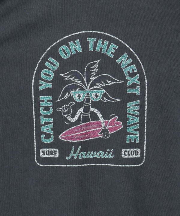 ヤシの木やハイビスカスなどのモチーフをあしらったハワイアンでロックなメンズTシャツ。ヴィンテージ感漂うピグメント加工が味わいをプラスします。存在感のあるデザインで、一枚でコーディネートに雰囲気を添えるサーフカジュアルなスタイルにおすすめです。