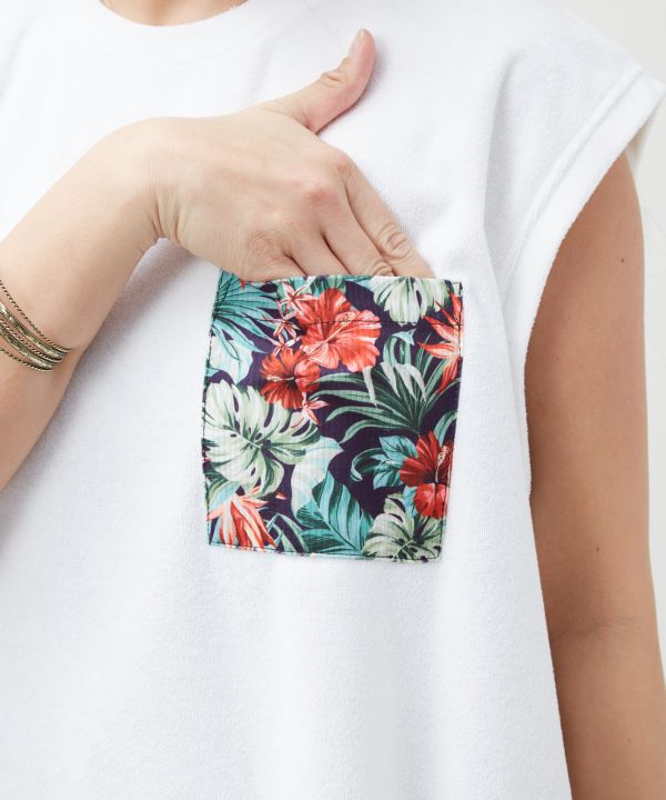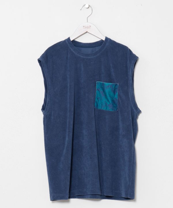 やわらかなパイル生地のメンズタンクトップ。軽やかな着心地で、開放感のあるスタイルを楽しめます。ポケットに使用したハワイアン柄の生地がアクセントとなり、さりげなく個性を演出。ハーフパンツやデニムと合わせたサーフカジュアルなコーディネートにおすすめです。