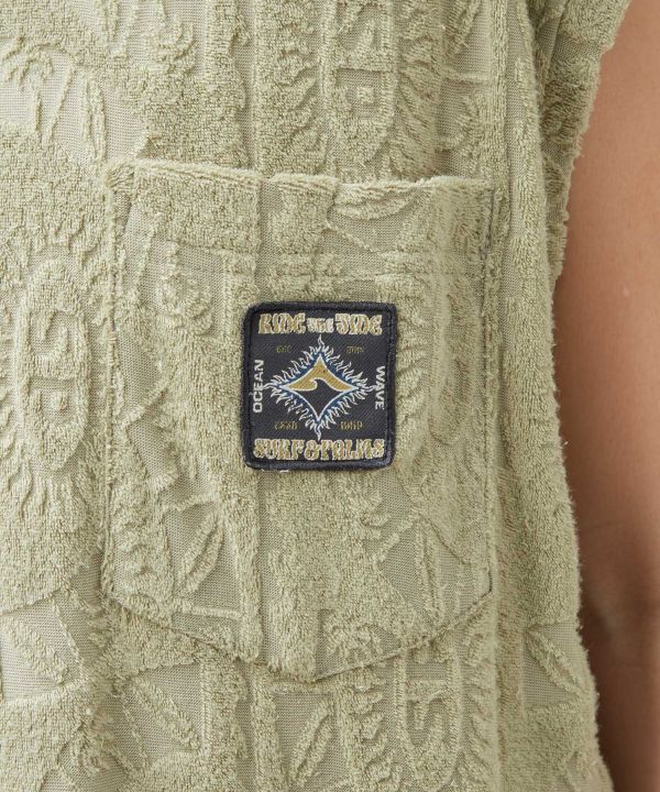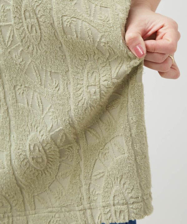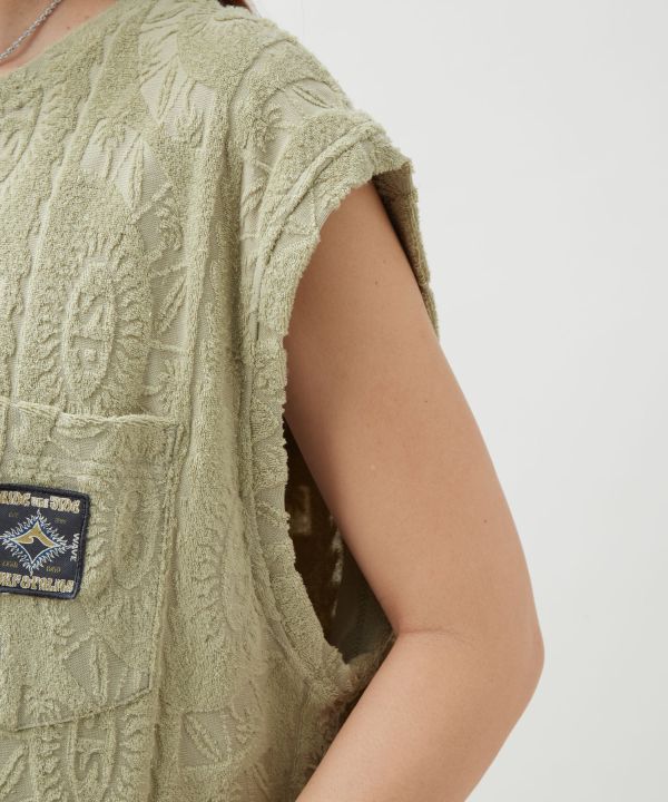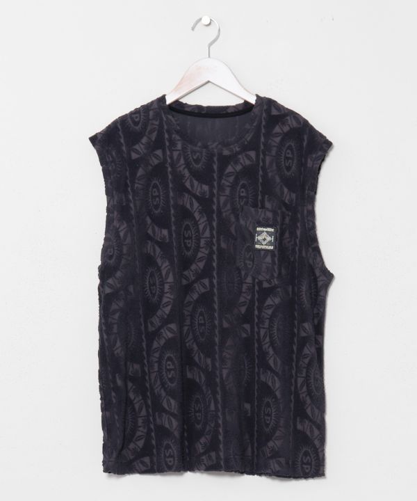 涼しげなオリジナル柄のパイル生地を使用したメンズタンクトップ。やわらかな着心地と開放感のあるデザインで、リゾートムード漂うスタイルを楽しめます。同シリーズのパンツと合わせたセットアップコーディネートにもおすすめの一着です。