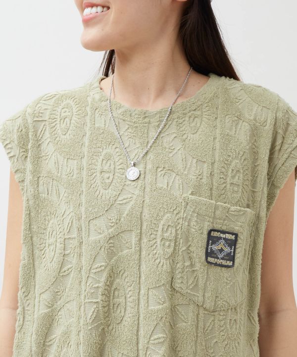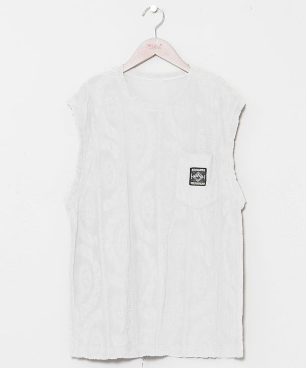 涼しげなオリジナル柄のパイル生地を使用したメンズタンクトップ。やわらかな着心地と開放感のあるデザインで、リゾートムード漂うスタイルを楽しめます。同シリーズのパンツと合わせたセットアップコーディネートにもおすすめの一着です。
