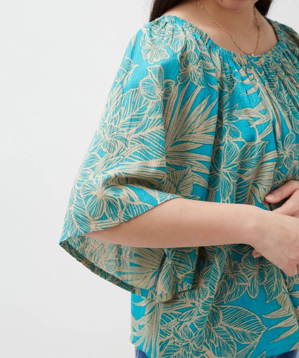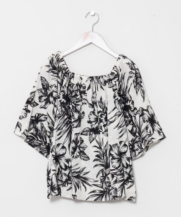 通気性の良いコットンレーヨン素材で仕立てたトップス。やわらかな風合いが心地よく、オフショルダーとしても着用できる2WAY仕様です。気になる腕周りをさりげなくカバーする袖デザインも魅力。ボタニカルモチーフのハワイアン柄が華やかに映え、リゾート感あふれるコーディネートにおすすめです。