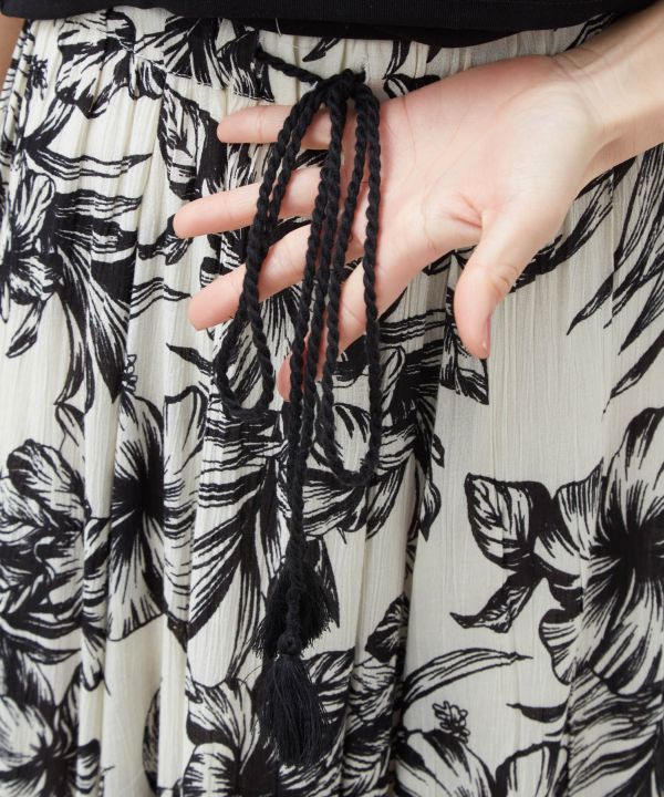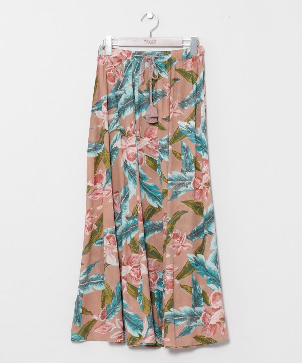 軽やかなコットンレーヨン素材を使用したロングスカート。通気性が良く、ふんわりと揺れるシルエットが女性らしさを演出します。ウエストにはタッセル紐をあしらい、さりげないアクセントに。ボタニカルモチーフのハワイアン柄が映える、リゾートスタイルにおすすめの一着です。