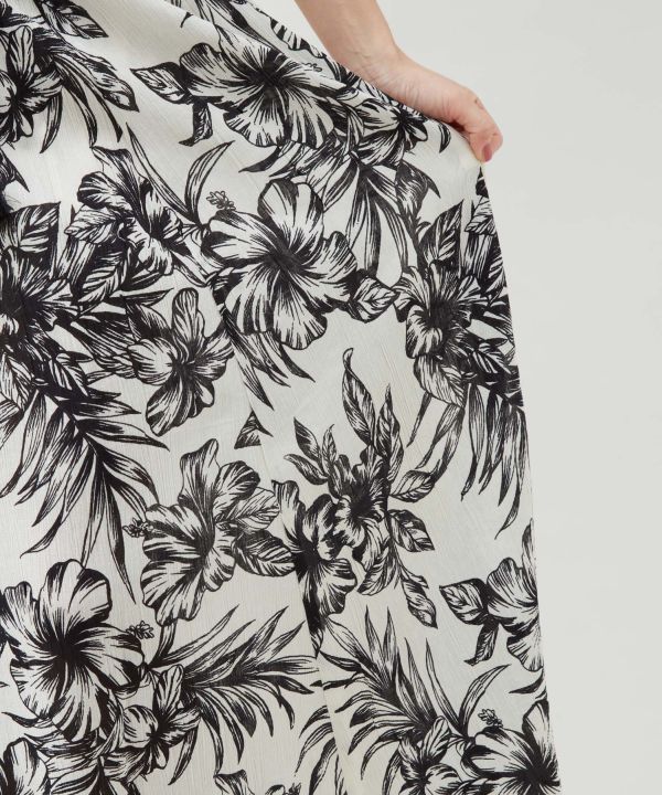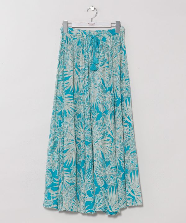 軽やかなコットンレーヨン素材を使用したロングスカート。通気性が良く、ふんわりと揺れるシルエットが女性らしさを演出します。ウエストにはタッセル紐をあしらい、さりげないアクセントに。ボタニカルモチーフのハワイアン柄が映える、リゾートスタイルにおすすめの一着です。