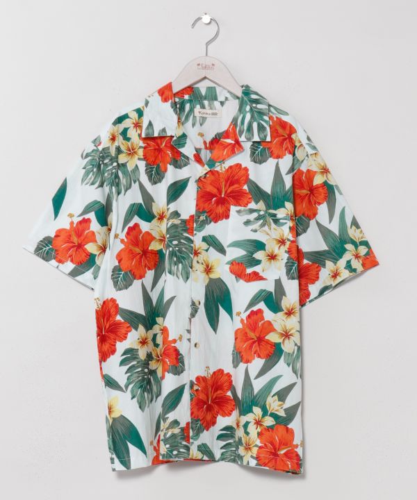 程よくハリのあるコットン生地で仕立てた開襟シャツ。すっきりとしたシルエットで着こなしやすく、デイリーにも取り入れやすいデザインです。ボタニカルモチーフのハワイアン柄が存在感を放ち、デニムやハーフパンツと合わせた爽やかなコーディネートにおすすめです。