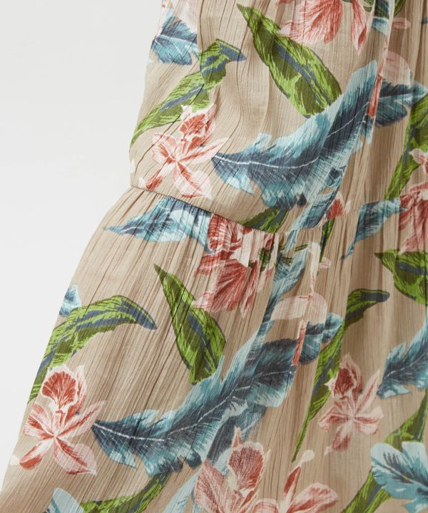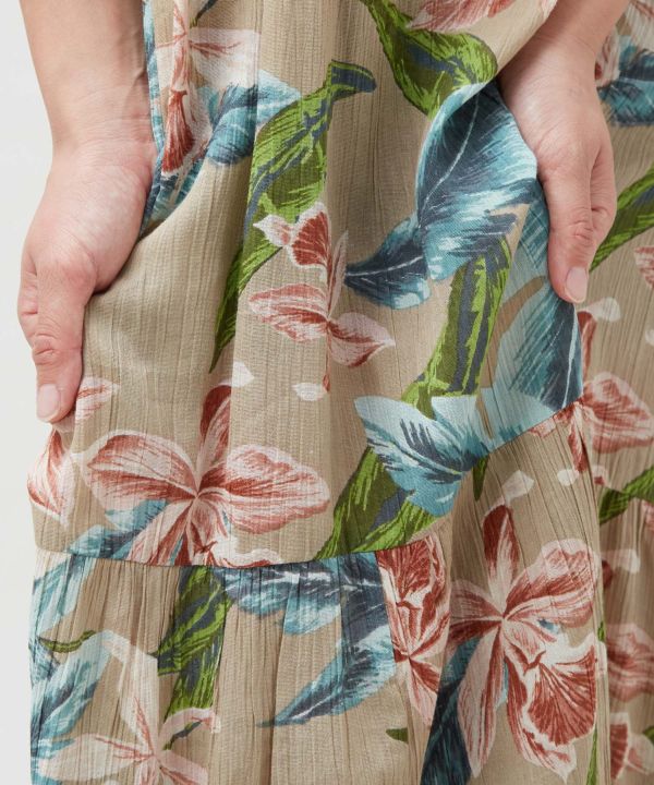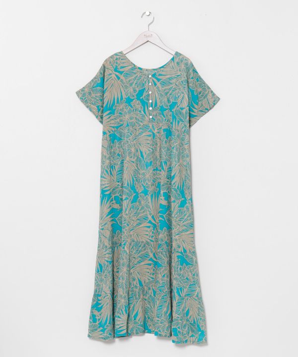 通気性の良いコットンレーヨン素材を使用したティアードワンピース。ドロップショルダーのゆったりとしたシルエットで、前後どちらを前にしても着用できる2WAY仕様です。ふんわりと広がるデザインにボタニカルモチーフのハワイアン柄が映え、リゾート感あふれる着こなしを楽しめます。