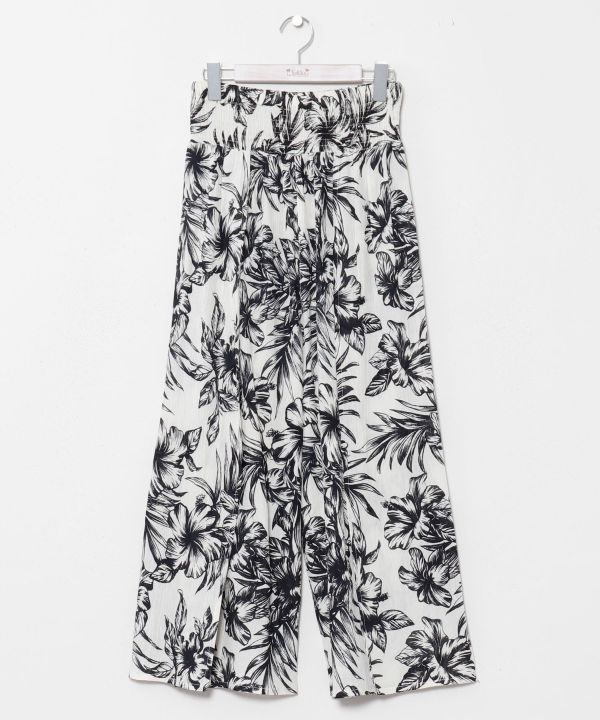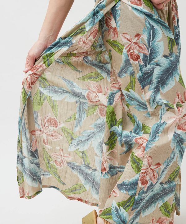 通気性の良いコットンレーヨン素材を使用したリゾート風の巻きパンツ。軽やかな風合いとゆったりとしたシルエットが女性らしさを引き立てます。ウエストはシャーリング仕様で快適な穿き心地。ボタニカルモチーフのハワイアン柄が華やかに映え、南国ムード漂うデザイン。