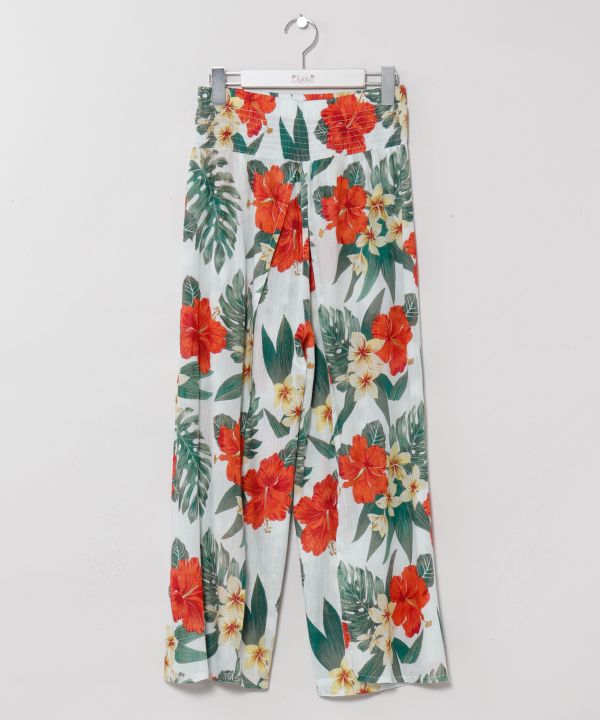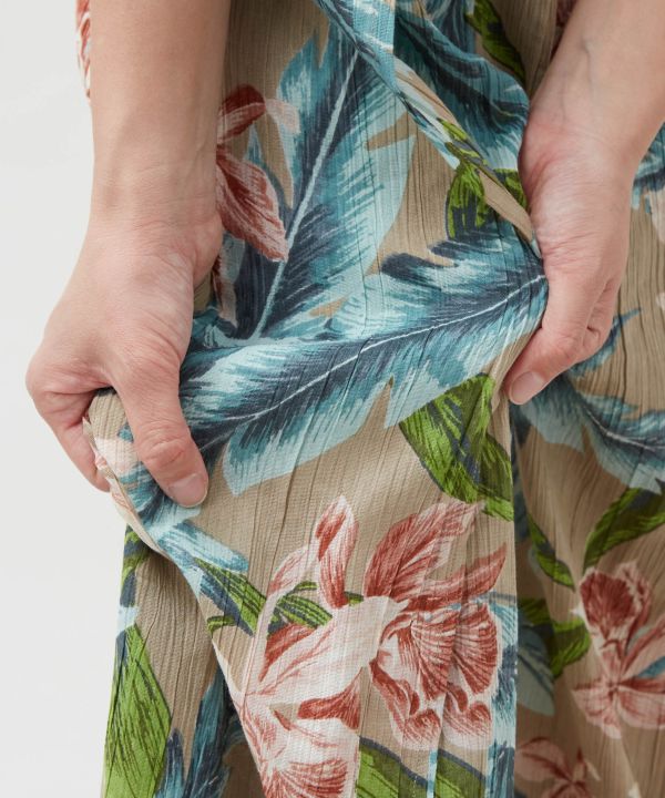 通気性の良いコットンレーヨン素材を使用したリゾート風の巻きパンツ。軽やかな風合いとゆったりとしたシルエットが女性らしさを引き立てます。ウエストはシャーリング仕様で快適な穿き心地。ボタニカルモチーフのハワイアン柄が華やかに映え、南国ムード漂うデザイン。