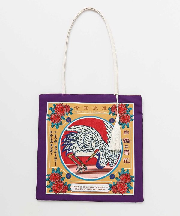 香図浪漫(こうずろまん)をテーマに、大正レトロなマッチ香をモチーフにしたトートバッグ。縁起の良い生き物と花を鮮やかな配色で組み合わせました。程よいサイズ感で使いやすく、揺れるタッセルが上品なアクセントに。日常使いに和の物語を添えるアイテムです。
