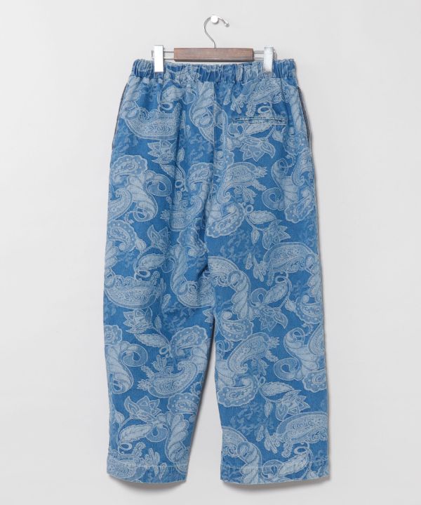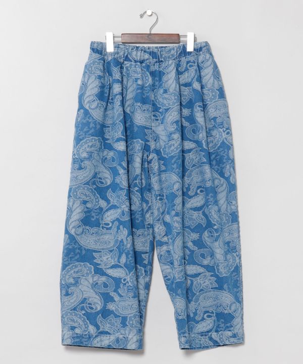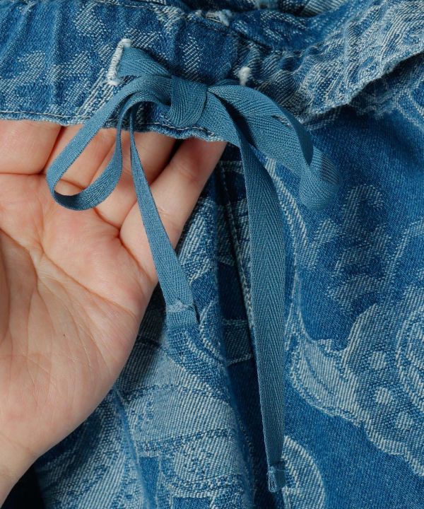 手織りカーペット「段通」から着想を得た繊細な柄が魅力のパンツ。ウエストゴムと紐で調整ができ、ストレートワイドなシルエットが際立ちます。