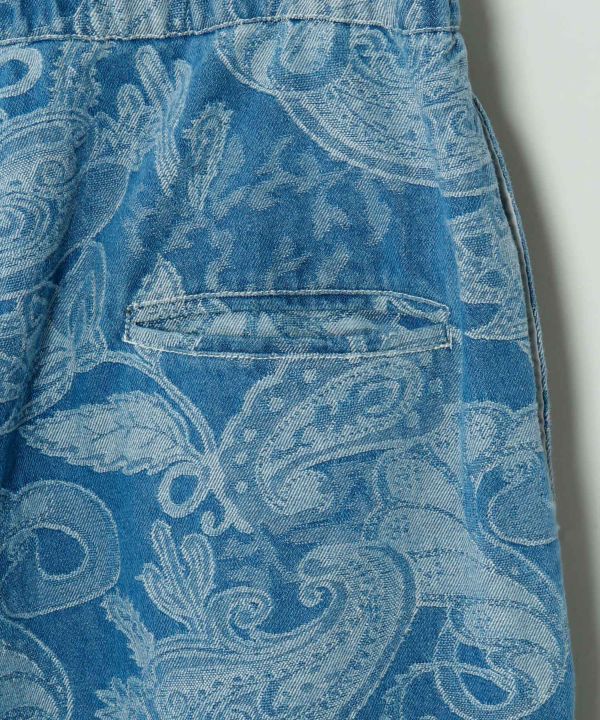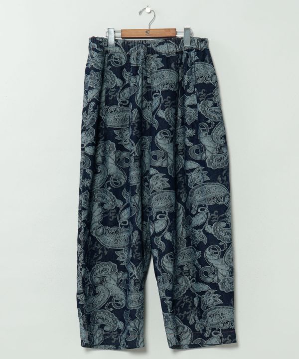 手織りカーペット「段通」から着想を得た繊細な柄が魅力のパンツ。ウエストゴムと紐で調整ができ、ストレートワイドなシルエットが際立ちます。
