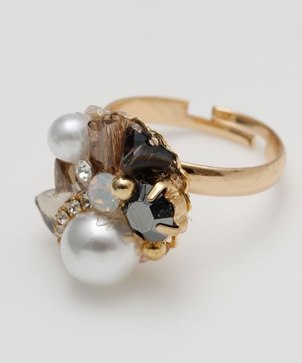 アンティーク調にビジューやパール風パーツをあしらった華やかなリング。程よい存在感があり、手元にクラシカルな彩りを添えます。