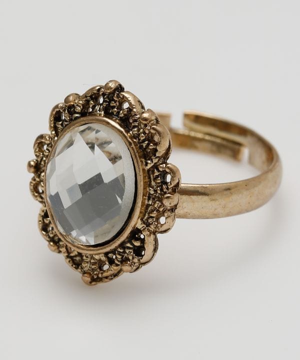 カットビジューがきらめく、クラシカルなフレームデザインのリング。アンティーク調の台座が上品な雰囲気を演出し、指先にヴィンテージライクな華やぎを添えます。