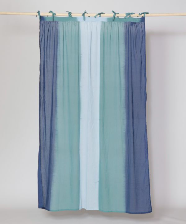 ギャザーを寄せてふんわり掛けられるようにしました。光をほどよく通すので、やわらかい光をお部屋に取り入れることができます。さらに光が入るとグラデーションが映えるデザインになっています。