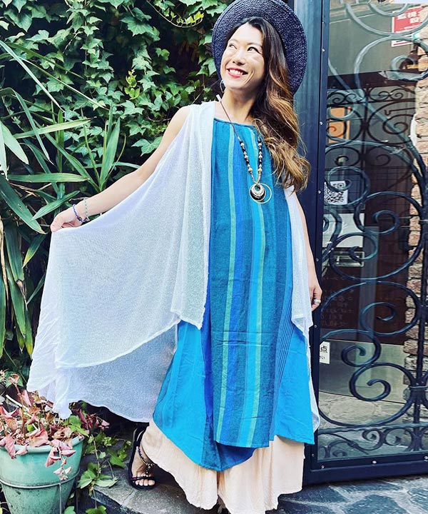 心地良い肌触りを楽しむ。柔らかなネパールコットンを使用したランダムなストライプのワンピース。三つ編みされた肩紐がシンプルなシルエットに個性を与えてくれる。アームホールも広めなので重ね着しやすいデザインに。心地よくすり抜ける風を楽しんで。