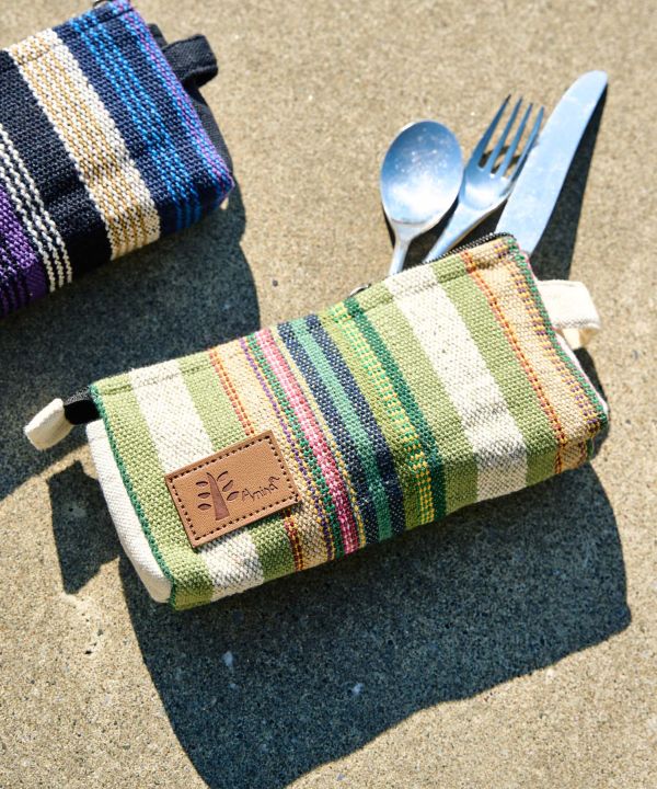 長年愛されるネパールの手織りボーダー生地を使ったペンポーチ。文房具だけじゃなくコスメの収納にもピッタリ。職人の息づかいとともに織りあがる、ざっくりとした生地の風合いをお楽しみください。